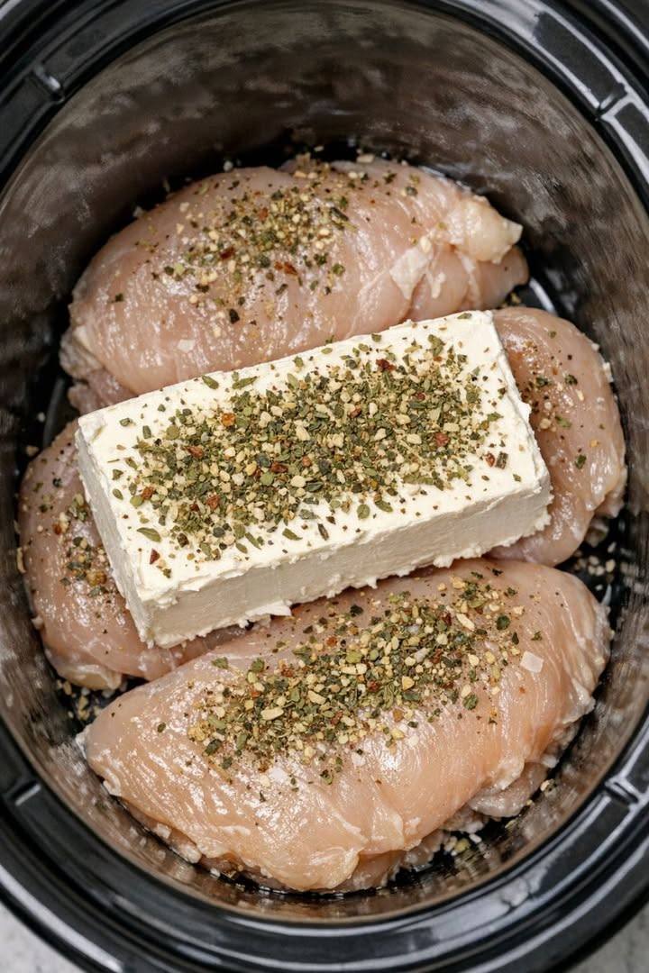Layer the Chicken: Place the raw chicken breasts in a single layer at the bottom of your slow cooker.
